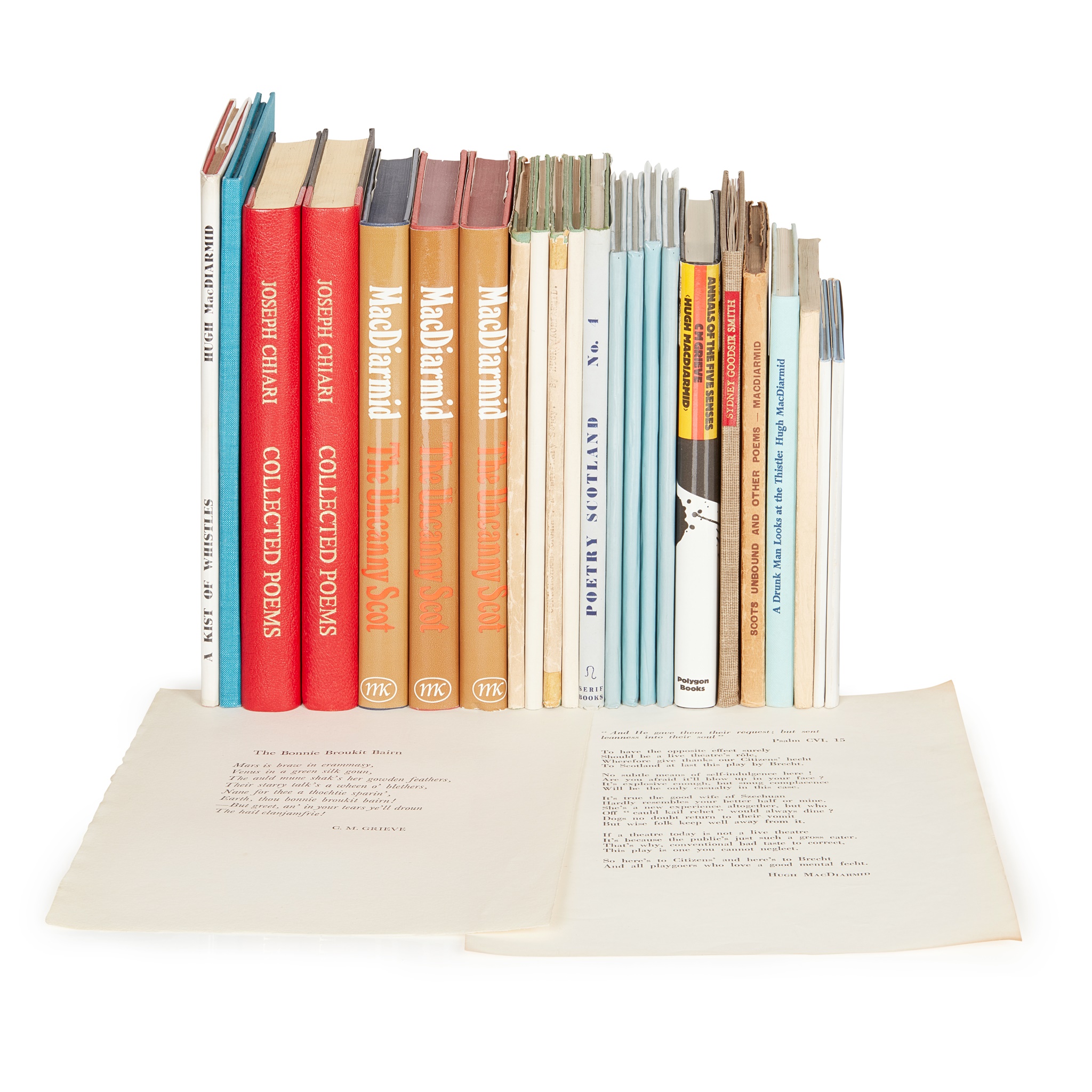 and 12 others including: Song of the Seraphim, [no date], each one of 100 copies signed by MacDiarmid; A Drunk Man Looks at the Thistle, 1962, fourth edition, signed by MacDiarmid; Annals of the Five Senses, new edition, 1983, inscribed by Valda Trevlyn; Joseph Chiari, Collected Poems, with a Preface by Hugh MacDiarmid, London: Enitharmon Press, 1978, 2 copies, each one of 30 signed by Chiari, 8vo, original red quarter morocco; and similar (some unsigned)