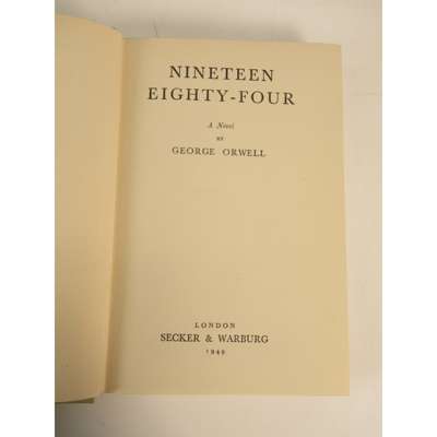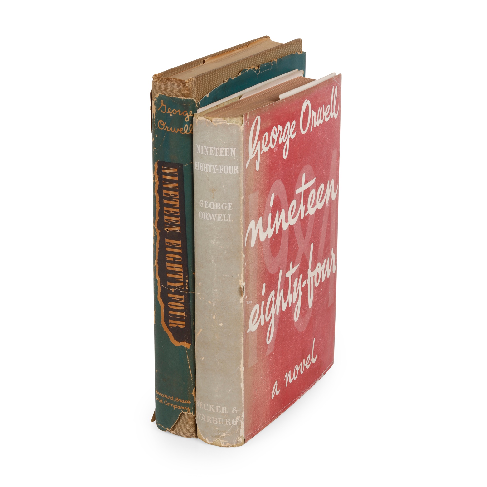 London: Secker & Warburg, 1949. First edition, first impression, original green cloth, dust-jacket not price-clipped but with fading to spine and some chipping at corners and along joints, some fading to spine; [Idem] Nineteen Eighty-Four. New York: Harcourt, Brace and Company, 1949. First US edition but with Book Club dot to rear cover, 8vo, dust-jacket not price-clipped, original brown cloth, some loss to dust-jacket, front free-endpaper lacking, annotations in blue biro (2)