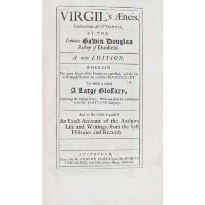 Edinburgh: Andrew Symson, 1710. Folio, with bound-in pamphlet Proposals for Reprinting, by Subscription, the Aeneids of Virgil..., modern library cloth, withdrawn stamp and a couple of perforated stamps of the Bancroft Library, University of California