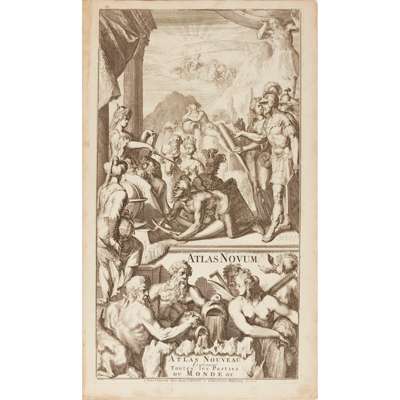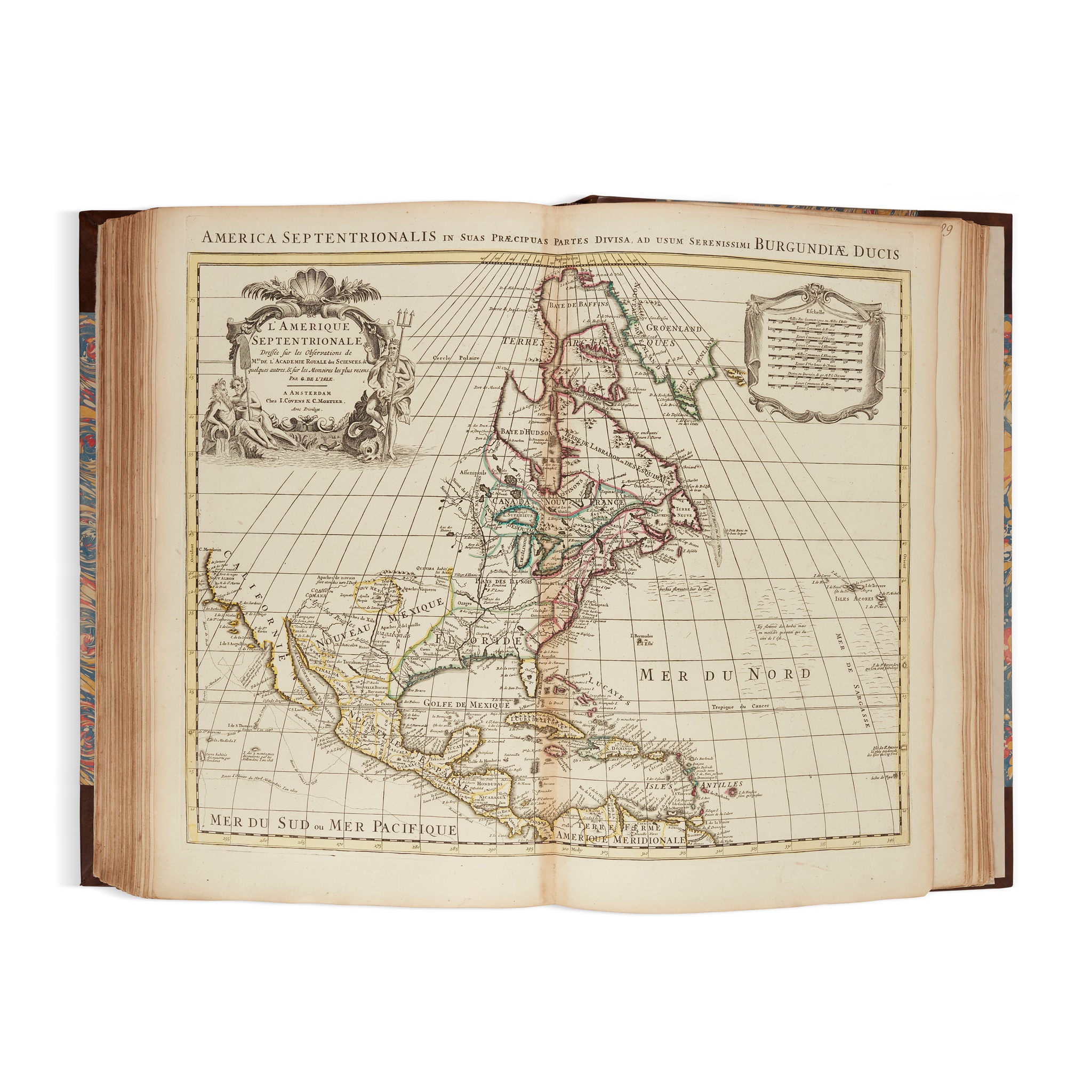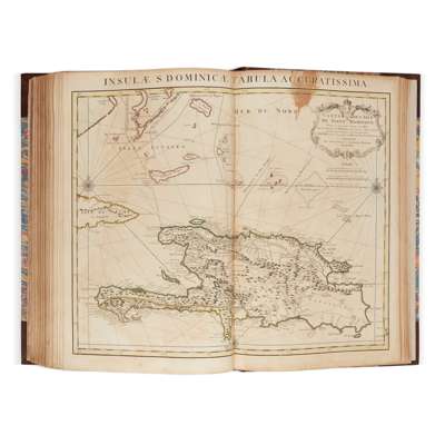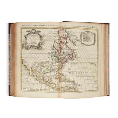 Contenant toutes les parties du Monde. Ou sont exactement Remarquées les Empires, Monarchies, Royaumes, Etats, Republiques &c., Amsterdam: Jean Covens & Corneille Mortier, [c.1745]. Folio, (530 x 330mm.), title printed in red and black with engraved vignette, additional engraved title ("Atlas Novum. Atlas Nouveau..."), [vi]. 32, [2 ("liste des cartes")], and 107 double-page or folding maps, hand-coloured in outline, text and maps mounted on original guards throughout (some guards neatly strengthened), finely rebound in period style half calf, marbled sides, spine gilt, raised bands, red morocco lettering piece, occasional light spot, small stain to Saint Domingue map, most maps with light discolouration at centre fold (where attached to guard)