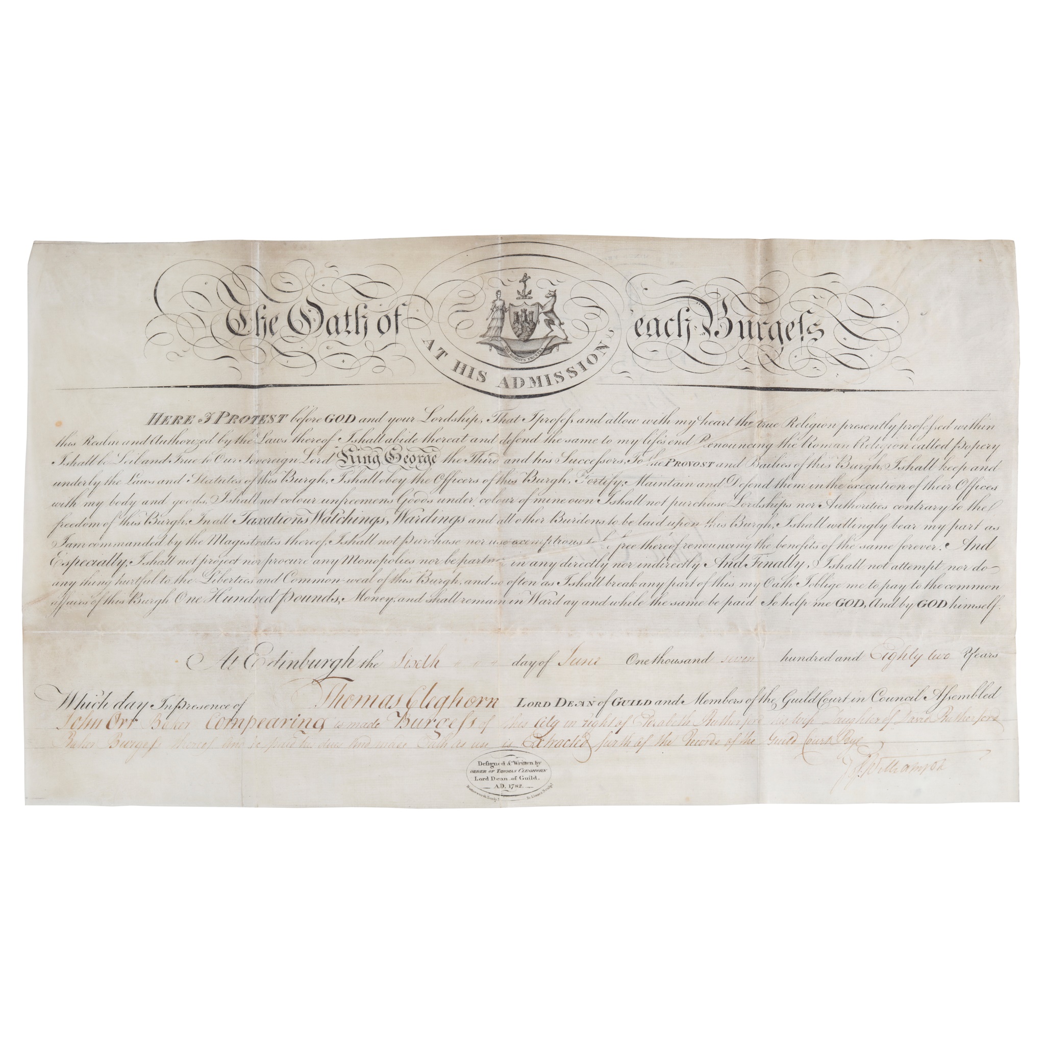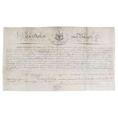 Edinburgh Burgess Ticket, on vellum, dated 1794, a similar one, on vellum, dated 1817; Signed copy of Oath of allegiance as Burgess of Edinburgh, on vellum, dated 1794, a Linlithgow Burgess ticket with original paper covered wax seal attached by original vellum tag; Edinburgh Militia Commission on paper, dated 1810, with red wax seal; Theatre Royal Edinburgh 10 bills for performances, including 1821 performance of Rob Roy MacGregor