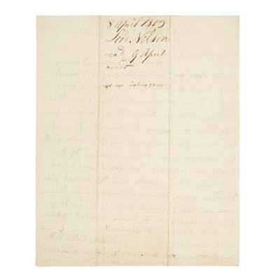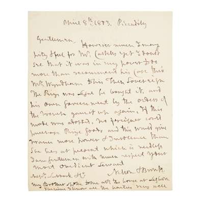 Dated Piccadilly [London], April 8, 1803, written on one side of a sheet 22 x 18cm, docketed on verso, signed "Nelson + Bronte", addressed to Messrs. Lubbock & Co., regretting the return of prize goods at the request of the French, apologizing for his inability to help, and proclaiming that, "if this mode were adopted no foreigner could purchase prize goods and this would give France more power and insolence than she has at present which is needless..."