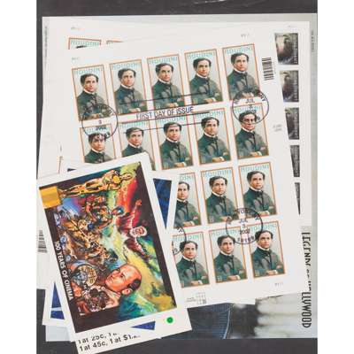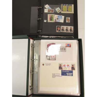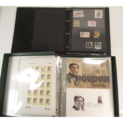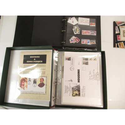 29 First Day covers, including Houdini, Hofzinser, A Century of Magic 1905-2005, Magic Through the Ages, Centenary of the Magic Circle, George Mileis, P.C. Sorcar, British Comedians, Phil Davies a Member of Chung Ling Soo Party, &c. and a large collection of stamps, most featuring magic, conjuring, & magicians; 3rd album containing First Day Covers for David Blaine and Criss Angel, Penn & Teller, Montel Carlo Magic Stars, Monaco Magic Stars, Jules Barbey D'Aurevelly, Sacha Guitry, Laurent Mourguet, Paul Dukas Harry Houdini, Robert Houdin (x 7), John Henry Anderson (x 2), Australian Society of Magicians, & Convention, Jean Hugard (2004); Colin Palmer; postcards featuring Robert Houdin stamp on first day of postage (x 2); The Magic Circle Centenary (x 5); British Comedians; Monte-Carlo Magic Stars, XIII Grand Prix Magiques de Monte Carlo; and stamps issued to commemorate Howard Thurston, Harry Kellar, New England Magic Collectors Association (1992), Tony Rei, Prablier Rittersnich, David Copperfield (x 3), The Founding of the Magic Circle, Magic Circle Centenary Committee, signed; Magic Circle Centenary sheet of stamps, British Comedians, P.C. Sorcar, Monte Carlo Magic Stars, Chung Ling Soo, Charlie Chaplin; and miscellaneous other stamps (3)