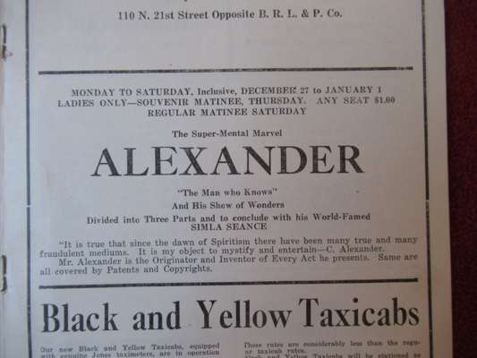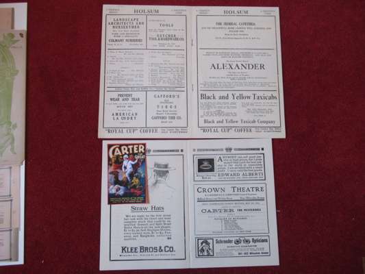 Theatre Programmes featuring The Great Lafayette, Horace Goldin, Cheffalo Master Magician, The Amazing Mr Rooklyn, Richiardi, P.T. Selbit, Kalanag with Gloria, Charles Morritt, Herr Carl Stackemann (with Autograph letter signed), Long Tack Sam, Ethel May, W. Dornfield, Frederick Culpitt, Leipzig, The Great Lyle, Jack le Dair, Dr. Walford Brodie, P.C. Sorcar, The Great Levante, The Great Raymond, Virgil and Julie, The Great Nicola, Grand Festival of Magic, Mr Perty Abbott, Chinese Magic, Silent Mora, Blackstone Magic Show, Houdini, Edward Victor, Jasper Maskelyne, Alexander, Gus Fowler, Jarrow, Siems, Madame Car Hertz, Carter, Franson, in secol folders in blue cloth case;