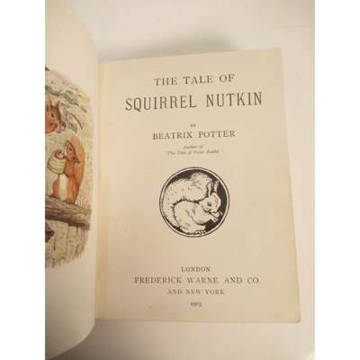 London: Frederick Warne and Co., 1903. First edition [Quinby 5 with endpapers matching Quinby plate I], 16mo, original dark grey boards with circular squirrel motif to upper cover, rebacked with later spine in black paper, hinges repaired and endpapers relaid, a little internal soiling and external rubbing, in black custom-made clamshell box