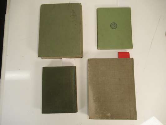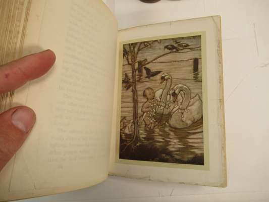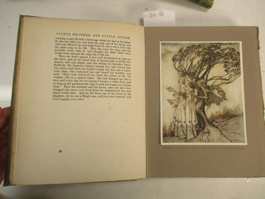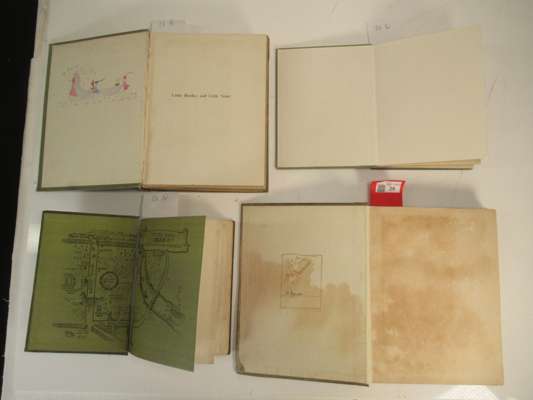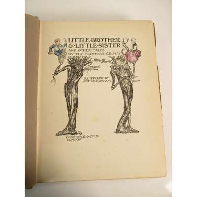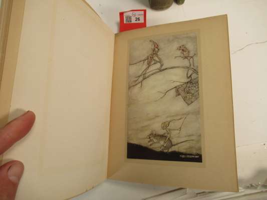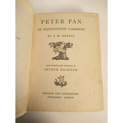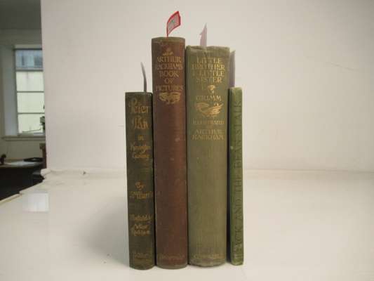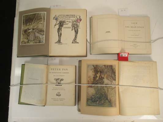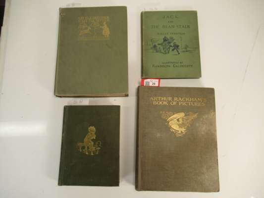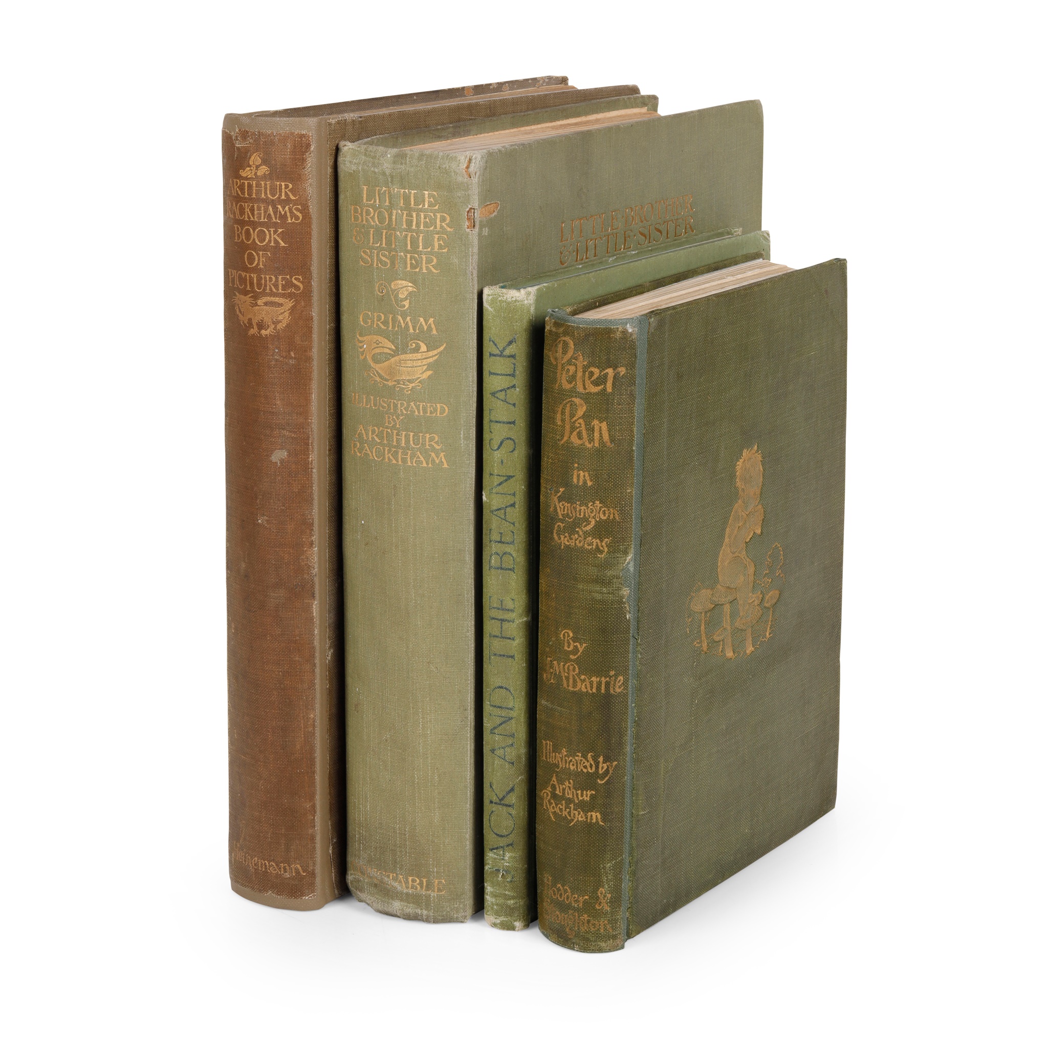 Arthur Rackham's Book of Pictures. London: William Heinemann, [1913]. 4to, original green cloth gilt neatly rebacked retaining original spine, a little foxing, some dampstaining to covers; Brothers Grimm - Arthur Rackham, illustrator Little Brother & Little Sister. London: Constable & Co. Ltd, [1917]. 4to, original green cloth gilt, a little soiling and scratching to covers, some very light foxing; Barrie, J.M. - Arthur Rackham, illustrator Peter Pan in Kensington Gardens. London: Hodder and Stoughton, [n.d. but 1910] 8vo, original green cloth gilt neatly rebacked retaining original spine; Tennyson, Hallam - Randolph Caldecott, illustrator Jack and the Bean-Stalk. London: Macmillan and Co., 1886. 8vo, original green cloth (4)