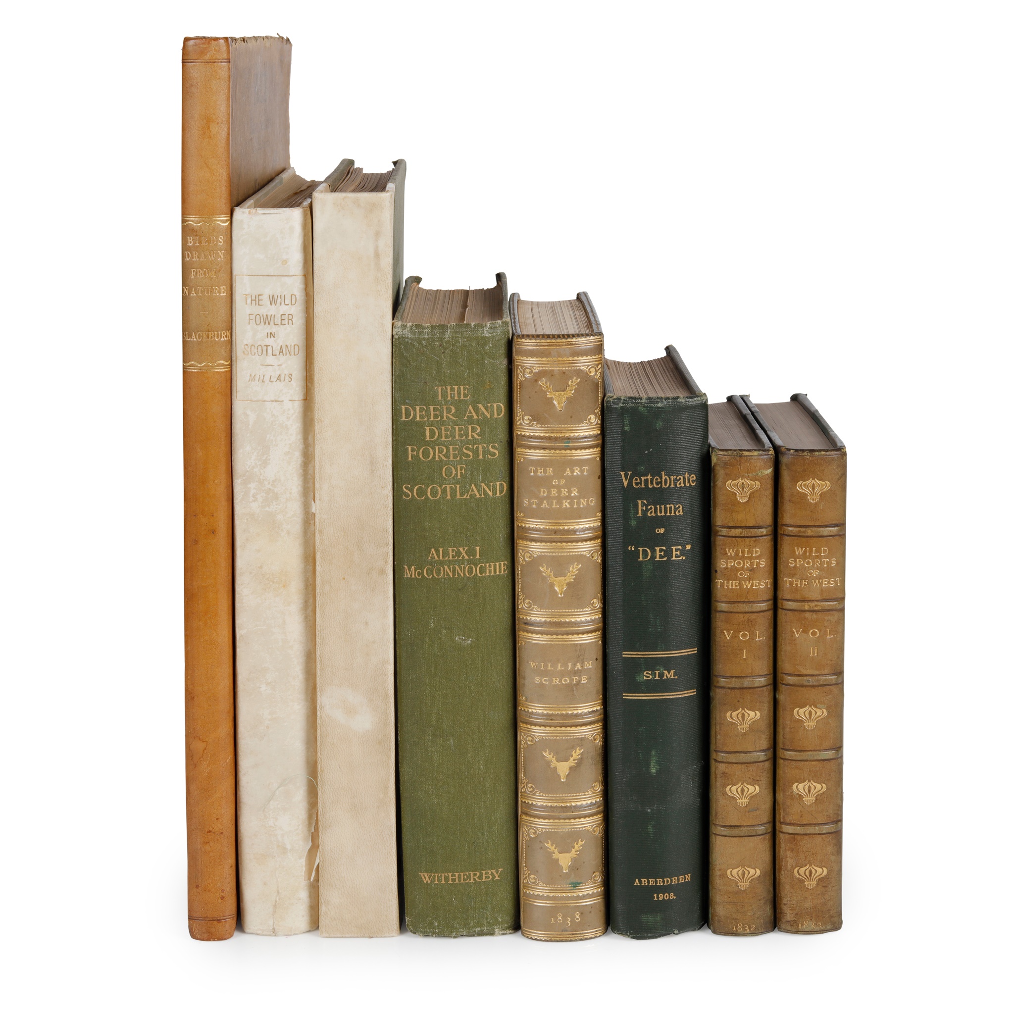 Mrs Blackburn Birds Drawn from Nature. Edinburgh: Edmonston & Douglas, 1862. Folio, 22 plates and pictorial title-page; Millais, John Guille The Wildfowler in Scotland. London: Longmans, Green, and Co., 1901. 4to, original half Japanese vellum gilt; Edwards, Lionel My Scottish Sketch Book. London: Country Life Ltd., 1929. 4to, original quarter vellum gilt; McConnochie, Alexander Inkson The Deer & Deer Forests of Scotland. London: H.F. & G. Witherby, 1923. 8vo, original green cloth gilt; Scrope, William The Art of Deer-Stalking. London: John Murray, 1838. 8vo, later green calf gilt with gilt stag head motifs to spine; Sim, George The Vertebrate Fauna of "Dee". Aberdeen: D. Wyllie & Son, 1903. 8vo, original green cloth gilt, stamp of the Northern Naturalists Club Aberdeen to title-page and half-title; [Maxwell, William Hamilton] Wild Sports of the West. London: Richard Bentley, 1832. 2 volumes, 8vo, contemporary half calf gilt (8)