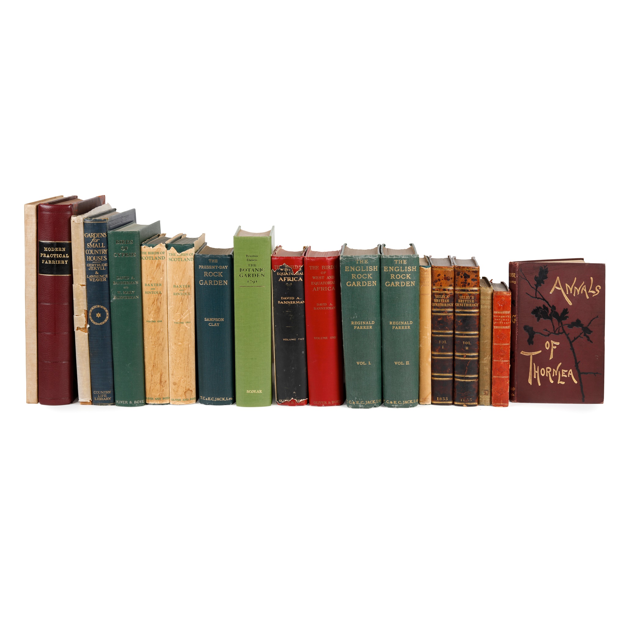 Miles, W. J Modern Practical Farriery. London: William MacKenzie; Clay, Simpson The Present Day Rock Garden. London: T.C. & E.C Jack Ltd, 1937; Baxter, V. Evelyn and Rintoul, Jeffrey Leonora The Birds of Scotland Volumes 1 & 2. Edinburgh: Oliver and Boyd, [1953]; Darwin, Erasmus The Botanic Garden. Yorkshire: The Scholar Press Limited 1973; Willis, Peter Furor Hortensis, Essays on the History of the English Landscape Garden In Memory of H.F.Clark. Edinburgh: Elysium Press Limited, 1974; Edwards, Lionel My Hunting Sketch Book. London: Eyre and Spottiswoode Limited, 1978; A.M. Traill Annals of Thornlea. Galashiels: D. Craighaed ‘Border Advertisers’ Office; Bannerman, David Armitage The birds of West and Equatorial Africa Volumes 1 & 2. Edinburgh: Oliver and Boyd, [1953]; Fairbairn, William Alexander Some Game Birds of West Africa. Edinburgh: Oliver and Boyd, [1952]; Selby, Prideaux John Illustrations of British Ornithology Volumes 1 & 2. Edinburgh: W.H. Lizars ,1833; and 6 Others