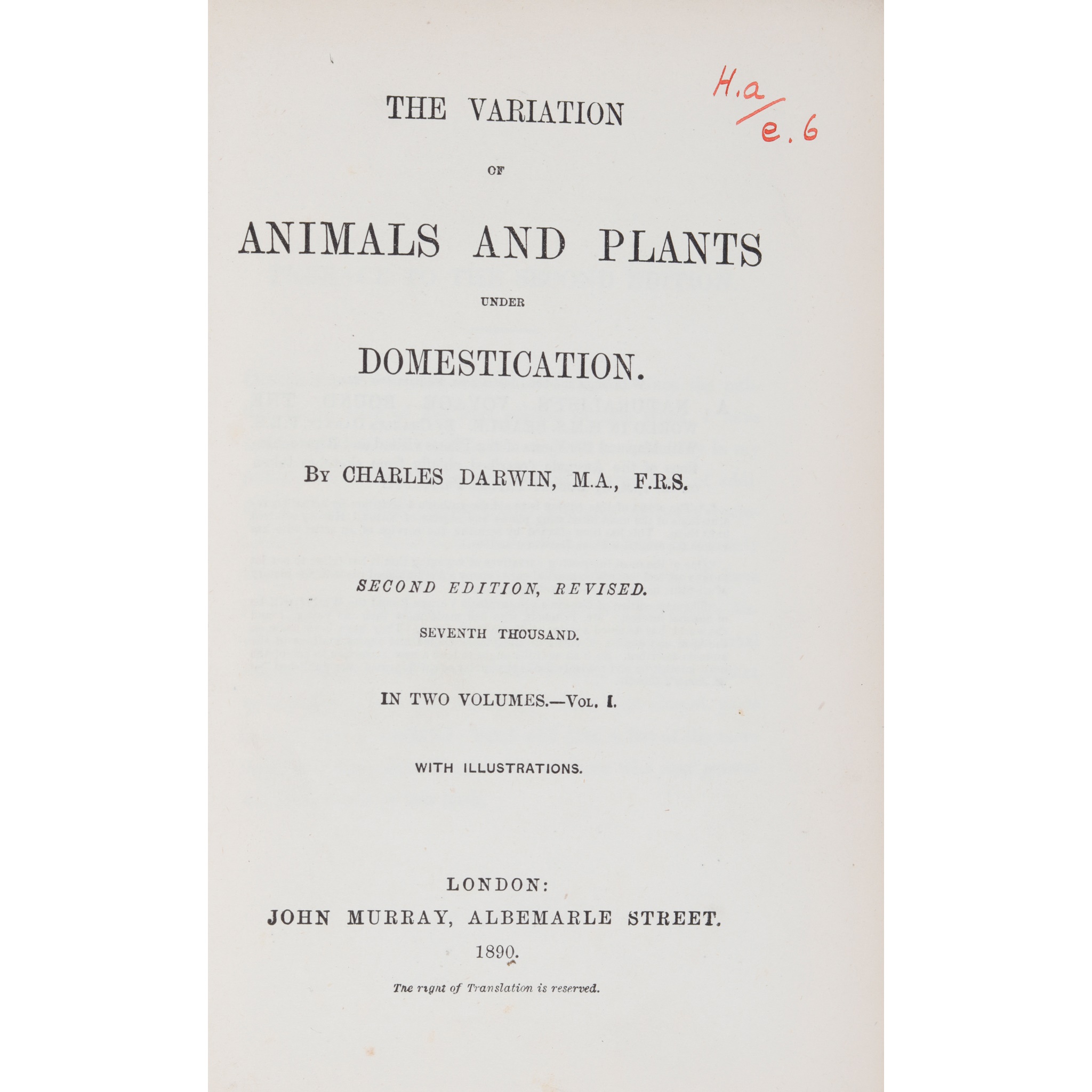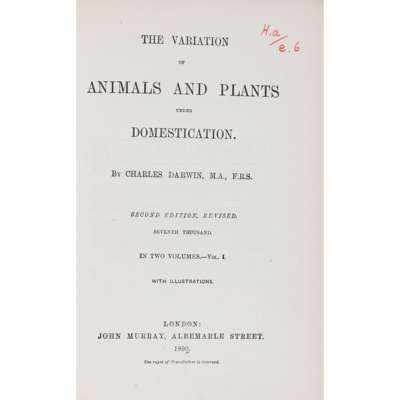 The Variation of Animals and Plants under Domestication. London: John Murray, 1890. 2 volumes, second edition (seventh thousand), 8vo, original blue-green cloth gilt; Heber, Reginald Narrative of a Journey through the Upper Provinces of India from Calcutta to Bombay. London: John Murray, 1828. Three volumes, second edition, 8vo, contemporary calf, some rubbing; Alcock, A.W. Zoological Gleanings. Simla: Government Central Printing Office, 1901. 4to, red coth gilt; Watson, E.Y. Herperidae Indicae. Madras: Vest and Company, 1891. 8vo, original cloth; Mukerji, Dev Report on the Burmese Fishes Collected by Lt.-Col. R.W. Burton from the Tributary Streams of the Mali Hka River of the Myitkyina District (Upper Burma), parts i & ii. [Calcutta, 1933]. 8vo, original wrappers; Phillips, John The Rivers, Mountains, and Sea-Coast of Yorkshire. London: John Murray, 1853. Subscribers' Edition, 8vo, original green cloth gilt; and a quantity of others, sold not subject to return