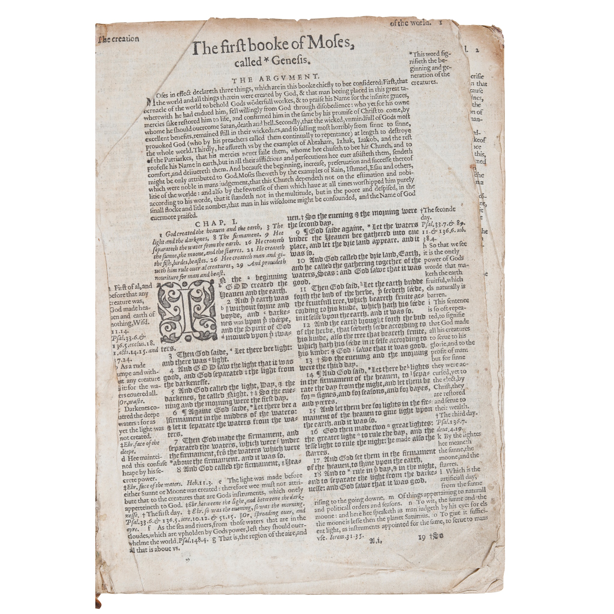 [London: Christopher Barker, 1588]. 8vo, corresponds to Herbert 197, New Testament title-page dated 1586, contemporary panelled calf, rubbed, lacking Old Testament title, 'Address' leaf, xx7 and Ppp6, a few tears with some loss affecting sidenotes, bound with the Tables (possibly lacking a final leaf); [bound with] The Whole Book of Psalms. London: R.W. for the Company of Stationers, 1658. 8vo, lacking several leaves, a little very light dampstaining, in custom made clamshell box