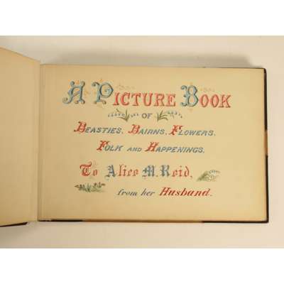 Three albums, each 13 x 18cm, calligraphically inscribed to Arthur Sankey Reid's wife, Alice M. Reid, and entitled: "They and These: a Picture Book of Beasties, Bairns, Flowers, Folk and Happenings" containing 75 photographs (matte collodion?) printed directly onto the album leaves and captioned by hand, dated 1891-1904; "A Book of Glenalmond" containing 53 photographs printed directly onto the album leaves showing the local countryside and games at Glenalmond College, dated 1890-1903; "The Island of Eigg" containing 79 photographs depicting the geography and people of the Isle of Eigg, dated 1898-1901; the three albums uniformly bound in blue half morocco gilt over buckram, the smallest image measures 4 x 4cm, with two images often being printed on one leaf (3)