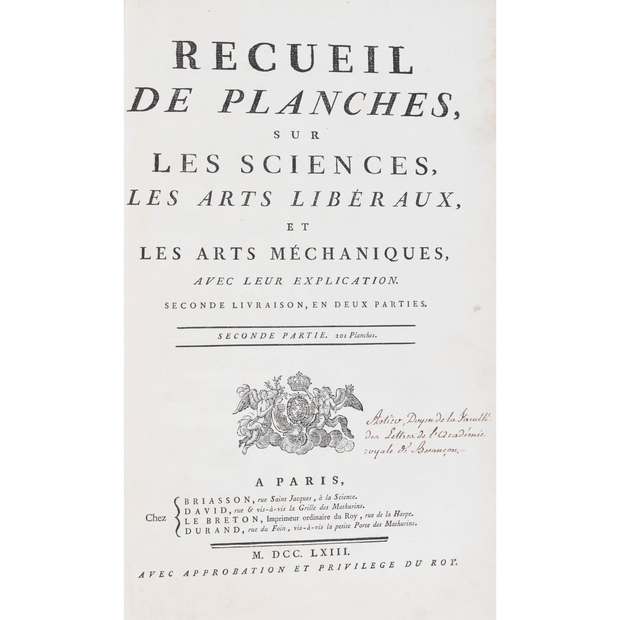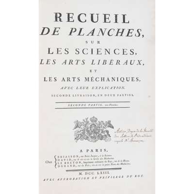 Recueil de Planches, sur les sciences, les arts libéraux et les arts méchaniques Seconde livraison, en deux parties. Paris: Briasson, David, Le Breton, Durand, 1763. Folio (25 x 39cm.), Second part only, 196 (of 201) plates, final plate repaired, contemporary calf, spine gilt, somewhat worn, small dampstain to fore-margin of a few plates, extremities rubbed
