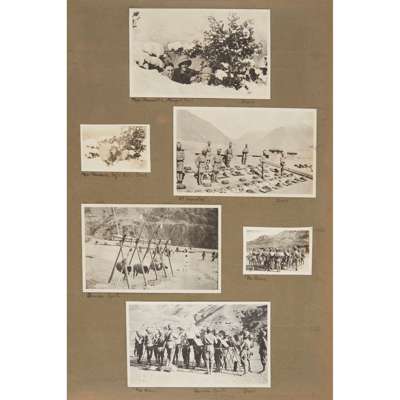 128 silver gelatin prints laid-down into an album, between 7 x 5cm and 14 x 8.5cm, including views of The Murree Road, groups of both local and British soldiers, views of Drosh including local people and houses, kit inspections and training exercises for local soldiers, views of Chitral, views of Madaglasht, 'Releasing Prisoners for Service' in Karachi, and other images of local life and scenery, album size: 30 x 41.5cm