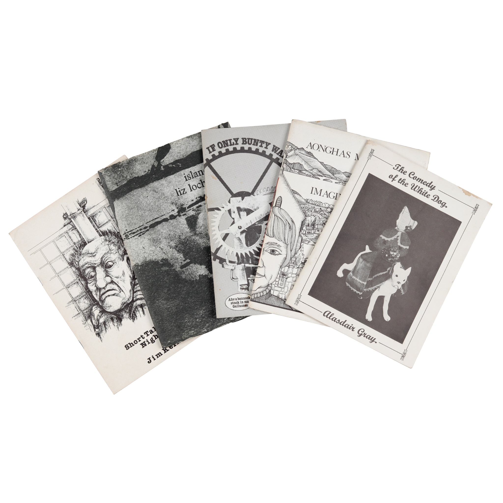 Gray, Alasdair The Comedy of the White Dog, 8vo, original wrappers, signed by Gray, a little dampstaining to upper edges; MacNeacail, Aonghas Imaginary Wounds, 8vo, original wrappers, signed by MacNeacail, some slight soiling; Leonard, Tom If Only Bunty was Here, 8vo, original wrappers, signed by Leonard, some slight spotting; Lochhead, Liz Islands. 8vo, original wrappers, signed by Lochhead; Kelman, Jim Short Tales from the Night Shift, 8vo, original wrappers, signed by Kelman (5)