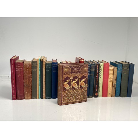 Kelly, R. Talbot Burma, painted ad described. London: Adam and Charles Black, 1905. 8vo, original decorative maroon cloth gilt; Williams, J.H. Bandoola. London: Rupert Hart-Davis, 1953. 8vo, later calf, a little repaired worming; [Idem] Elephant Bill. London: Rupert Hart-Davis, 1950. 8vo, later calf, title repaired; Evans, G.H. Elephants and their Diseases. Rangoon, 1961. 8vo, later calf; Collins, Maurice Last and First in Burma (1941-1948). London: Faber and Faber Limited, [1956]. 8vo, calf, title repaired; Brown, R. Grant Burma as I Saw it. New York: Frederick A. Stokes Company, [n.d.] 8vo, original green cloth gilt; Yoe, Shway The Burman, his life and notions. London: Macmillan and Co., 1910. Third edition, 8vo, original red cloth gilt; Whitehead, George In the Nicobar Islands. London: Seeley, Service & Co. Limited, 1924. 8vo, original red cloth, cloth varnished, browned; Myint, Ni Ni Burma's Struggle against British Imperialism. Rangoon: The Universities Press, 1983. 8vo, red cloth; Shakespear, L.W. History of Upper Assam, Upper Burmah and North-Eastern Frontier. London: Macmillan and Co., Limited, 1914. 8vo, original blue cloth gilt, soiled, some repaired worming; and 16 others, sold not subject to return