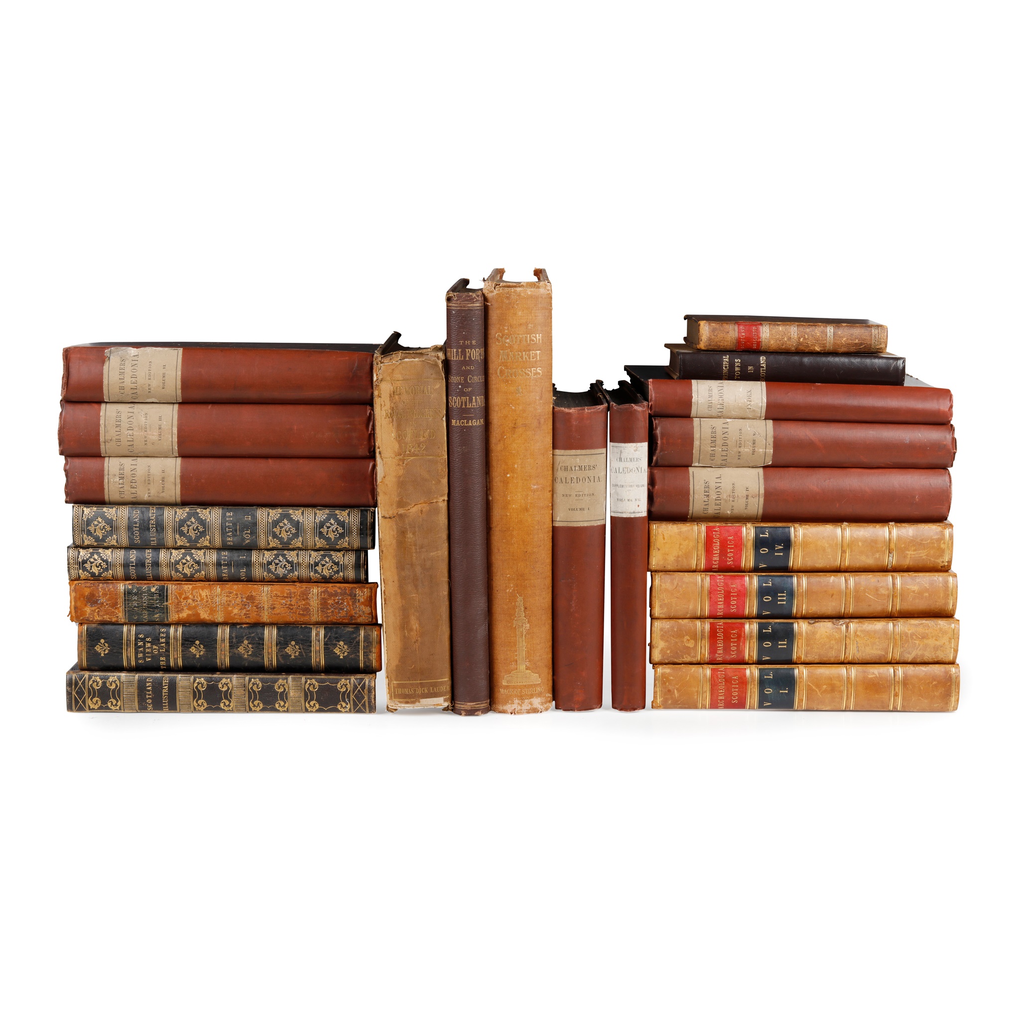 Scotland Illustrated. 1838, 2 volumes, 4to, additional engraved titles, folding map, engraved plates, contemporary blue half calf, spines gilt, some light spotting; Scotland Described, or a Topographical Description of all the Counties of Scotland. Edinburgh: J. Moir, 1799. 12mo, folding hand-coloured map, contemporary calf, Fasque bookplate; Wood, John Descriptive Account of the Principal Towns in Scotland to accompany Wood's Town Atlas. Edinburgh, 1828, 8vo, modern quarter calf; Archaeologia Scotica, or Transactions of the Society of Antiquaries of Scotland. Edinburgh, 1792-1857, volumes 1-4, plates, some coloured, 19th century half calf gilt, one joint splitting; Lauder, Sir Thomas Dick Memorial of the Royal Progress in Scotland. Edinburgh, 1843. 4to, 13 plates on india paper, original cloth, worn; Maclagan, Christian The Hill Forts, Stone Circles and other Structural Remains of Ancient Scotland. Edinburgh, 1875, Folio, frontispiece and 39 plates, original pictorial brown cloth gilt, rubbed; Small, John W. Scottish Market Crosses. Stirling, 1900. Large 4to, number 165 of 500 copies, original maroon pictorial buckram gilt, t.e.g., slightly worn, hinges weak; Wilson, Professor Scotland Illustrated in a Series of Eighty Views. 1850. 4to, 80 plates, contemporary brown half morocco gilt, a little spotting; Fleming, John and John M. Leighton The Lakes of Scotland, a Series of views. Glasgow: J. Swan, 1834. 4to, 52 engraved plates on india paper, one slightly cut down, contemporary calf, rubbed, corners very worn; Carr, Sir John Caledonian Sketches, or a Tour through Scotland in 1807. London, 1809. 4to, folding frontispiece, and 11 aquatint plates, contemporary half calf, rubbed, rebacked retaining spine, upper joint splitting, slightly spotted; Chalmers, George Caledonia, or a Historical and Topographical Account of North Britain. Paisley, 1887-1902. 8 volumes including index, 4to, plates and maps, original boards, uncut, stamp of Faculty of Procurators in Glasgow to boards (21)