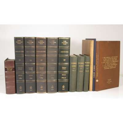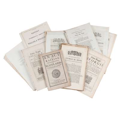 An Act in Raising Fifteen thousand Pounds Sterling in Scotland. London: Henry Hills and John Field, 1657; An Account of what Number of Ships from Scotland have been employed in the Whale Fishery to Davis's Straits and the Greenland Seas, in the Year 1819; An Act for errecting a Light House on the Bell or Cape Rock... London: George Eyre and Andrew Strahan, 1806. 2 leaves only from a bound volume; Report of the Departmental Committee on Whaling & Whale-Curing in the North of Scotland. Edinburgh, 1904. 2 unbound volumes; and a quantity of other loose acts; [AND] British Parliamentary Papers Report of Her Majesty's Commissioners of Inquiry into the Condition of the Crofters and Cottars in the Highlands and Islands of Scotland... [Dublin: Irish University Press, n.d.] Facsimile volumes 21-25 of British Parliamentary Papers from 1884-1891, folio, green quarter morocco gilt; [AND] A bound volume of Church of Scotland Pamphlets from 1689-1694; and 6 others
