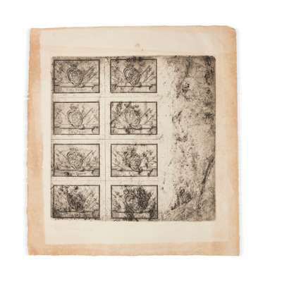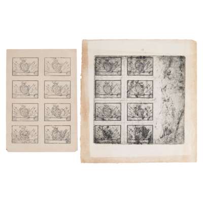From the copper plate, with eight designs, 563 x 420mm., of C.P. (monogram for Charles Prince, or Carolus Princeps), on a cartouche with coronet and Prince of Wales' feathers above, over a trophy of arms and flags, on the entablature below are the values of the designs, - One, Two, Three and Six-Pence; the other four being left blank, "the interior part to be filled up by clerks" (Sir Robert Strange's Memoirs), the whole engraved surface 223 x 224mm., inscribed "Printed by D.Y. Cameron 10.7.1928", margins somewhat browned