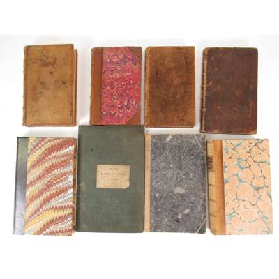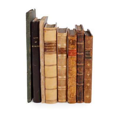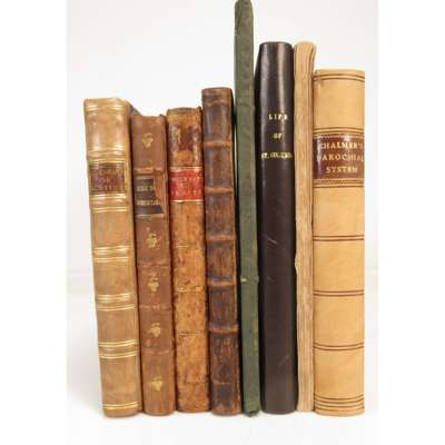 The Interest of Scotland Considered. Edinburgh: R. Fleming & Co., 1733. 8vo, contemporary calf, neatly rebacked, spine gilt; Irvine, Christopher Historiae Scoticae Nomenclatura Latino-Vernacula. Edinburgh, G. Shaw, 1682. 8vo, 19th century half calf, somewhat soiled, rubbed; Urquhart of Cromarty, Sir Thomas Tracts of the learned and Celebrated Antiquarian. Edinburgh, 1774. 12mo, contemporary tree calf, head of spine rubbed; Willison, John A Fair and Impartial Testimony, essayed in name of a number of Ministers, Elders and Christian People. Glasgow: J.F. Wright, 1765, 12mo, list of subscribers at end, contemporary calf, slightly rubbed; Smith, John The Life of St. Columba. Edinburgh, 1798. 8vo, modern quarter calf, some spotting and dust-soiling; Smith, George Essay on the Construction of Cottages suited for the Dwellings of the Labouring Classes. Glasgow, 1834, 8vo, engraved title with vignette, 11 folding plates and plans, original cloth, paper label to upper board, some staining and soiling; Fraser, Hon A. Tracts. Inverness, J. Young, 1803, inscribed "To the Library of Castle Grant from the Author", marbled wrappers, slightly spotted; Chalmers, Thomas The Sufficiency of a Parochial System, without a Poor Rate. Glasgow: W. Collins, 1841. 12mo, modern quarter calf, morocco label (8)