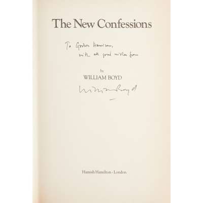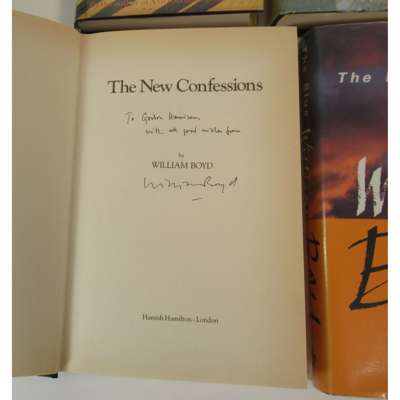 Boyd, William An Ice Cream War, 1982. Signed copy; [Idem] Brazzaville Beach, 1990. Number 34 of 150 copies signed and specially bound, original cloth-backed marbled boards; [Idem] The Blue Afternoon,1993. Signed copy; [Idem] The New Confessions. 1997. Inscribed to Gordon Harrison; [Idem] Armadillo, 1998. Signed copy; [Idem] Nat Tate. Signed copy; [Idem] Any Human Heart, 2002. Signed copy; all but the Brazzaville Beach with dustwrappers, none price-clipped; Mackenzie, Compton Poems. Oxford: B.H. Blackwell, 1907. 8vo, original grey wrappers; Mew, Charlotte The Farmer's Bride. London: The Poetry Bookshop, 1916. 8vo, original wrappers, Charles Ballantyne bookplate; Lindsay, Nicholas Vachel General William Booth enters into Heaven. New York: Mitchell Kennerley, 1913. 8vo, original red cloth gilt; Plowman, Max First Poems. London: Sidgwick & Jackson, Ltd., 1913. 8vo, original brown cloth gilt; Pitter, Ruth First Poems. London: Cecil Palmer, 1920. 8vo, original grey paper covered boards; Shanks, Edward Songs. London: The Poetry Bookshop, 1915. 8vo, original printed wrappers; Rickword, Edgell Behind the Eyes. London: Sidgwick & Jackson, Ltd., 1921. 8vo, original paper-covered boards; Prince, F.T. Poems. London: Faber and Faber Limited, 1938. 8vo, dust-jacket not price-clipped; Redgrove, Peter The Collector, and other poems. London: Routledge and Kegan Paul, 1959. 8vo, dust-jacket price-clipped; Silkin, Jon The Peaceable Kingdom. London: Chatto & Windus, 1954. 8vo, dust-jacket not price-clipped; Skelton, Robin Patmos and Other Poems. London: Routledge & Kegan Paul, 1955. 8vo, dust-jacket not price-clipped; Litvinoff, Emanuel The Untried Soldier. London: Routledge, 1942. 8vo, wrappers clipped but retaining price; Fleming, Ian You Only Live Twice. London: Jonathan Cape, 1964. First edition, dustwrapper lightly frayed & lightly soiled, not price clipped; Gardner, John Licence Renewed. 1981, First edition, dustwrapper; Gardner, John For Special Services. 1982, dustwrapper slightly rubbed; Gardner, John Nobody Lives for Ever. 1986. First edition, dustwrapper (28)