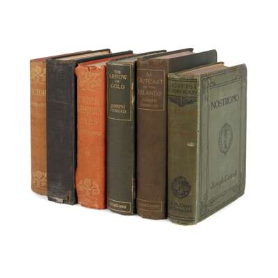 An Outcast of the Islands. London: T. Fisher Unwin, 1896. First edition, first impression, original green cloth gilt, annotations to endpapers, spine a little faded and frayed; [Idem] The Arrow of Gold. London: T. Fisher Unwin, Ltd., 1919; [Idem] Under Western Eyes. London: Methuen & Co. Ltd., 1911; [Idem] Victory. London: Methuen & Co. Ltd., 1915; [Idem] The Rover. London: T. Fisher Unwin Ltd, 1923; all first edition, 8vo, in original cloth; and a reissue of Nostromo (6)