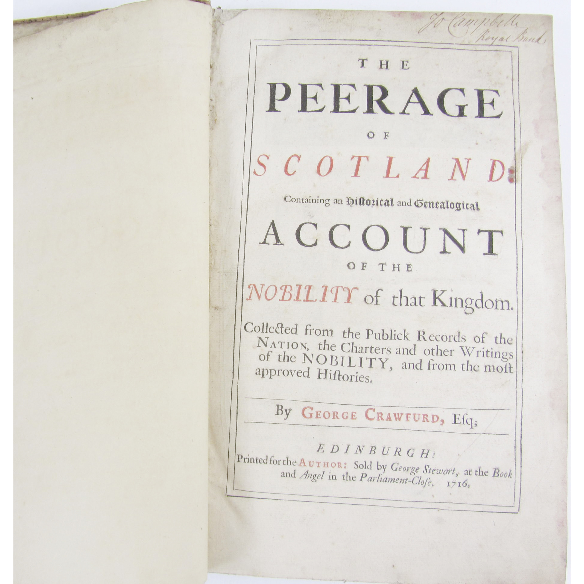The Baronage of Scotland. Edinburgh, 1798. Volume 1 (all published), folio, contemporary calf, worn, upper cover detached; Crawfurd, George The Peerage of Scotland. Edinburgh, 1716. Folio, contemporary calf ; The Annals of Sporting and Fancy Gazette. 1825. Volumes 7-8 only, 8vo, each volume with 12 engraved plates, contemporary calf, rubbed, one cover detached (4)