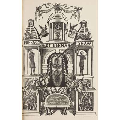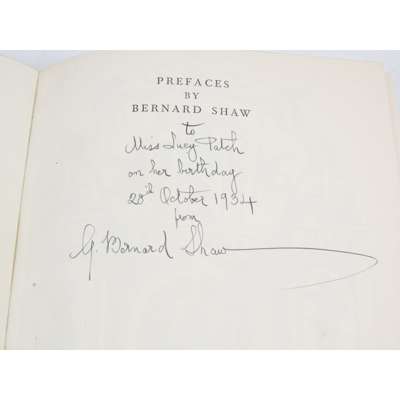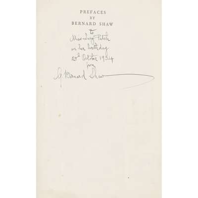 Prefaces. London: Constable, 1934. First edition, 8vo, presentation copy "To Miss Lucy Patch on her birthday 28th October 1934 from G. Bernard Shaw", red half morocco, top edges gilt