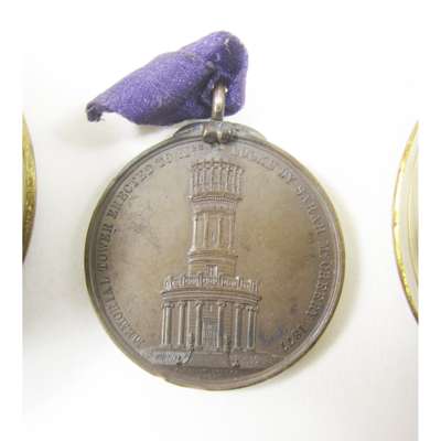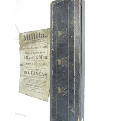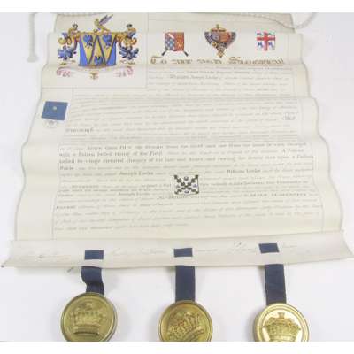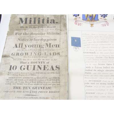 Grant and assign of arms, to Joseph Locke, by Sir Charles George Young, Knight Garter principal King of Arms, Francis Martin Esquire, Clarenceux King of Arms, and James Pulman Esquire, Norroy King of Arms, on vellum, gilt arms at head, red wax seals in embossed gilt tins at foot, 18 Feb. 1818, 60 x 51.5cm, in original black morocco box tooled V.R., box very worn, hinge broken; Barnsley Tower Medallion. by R. Phene Spiers: Memorial Tower erected to Mrs Locke by Sarah McCreery, 1817. In recognition of the generosity of Miss McCreery who on 7 August 1877 added 20 acres of land to the Park of Barnsley previously presented by her sister Phoebe Locke; Militia Broadside Enlistment broadside for the Regular Militia to all young men & growing lads to enroll in the West Riding Regiments of Militia, 38 x 25cm, on board, somewhat soiled (3)