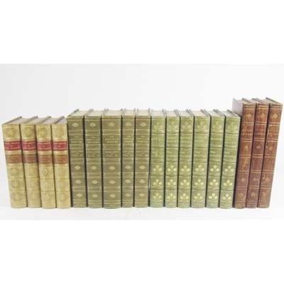 Destiny; or, The Chief's Daughter. Edinburgh: Robert Cadell, 1831, First edition, 3 vols., 12mo., title-page signed and inscribed by James Ballantyne to J.W.S.G[ardiner], contemporary half morocco, occasional marginal pencil annotations, some off-setting to endpapers, extremities rubbed, spines worn; Mackenzie, Henry. The man of feeling. London: W. Strahan and T. Cadell, 1783, New edition, 12mo, engraved frontispiece, contemporary calf, spine rebacked in modern calf, some soiling browning and spotting, extremities rubbed; together with a quantity of other 19th century works including those by John Gibson Lockhart, Thomas Babington Macaulay, Robert Browning, Jane Austen and Elizabeth Gaskell. (47)