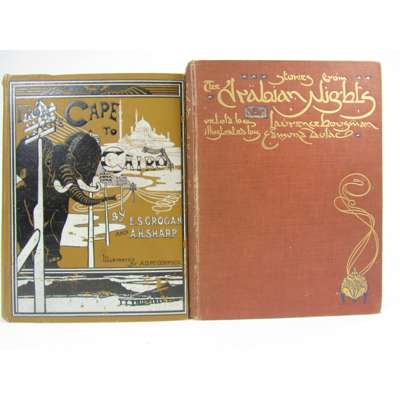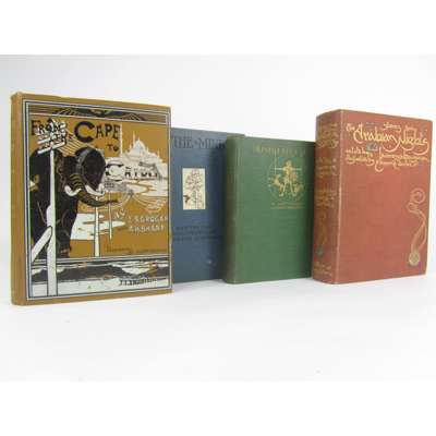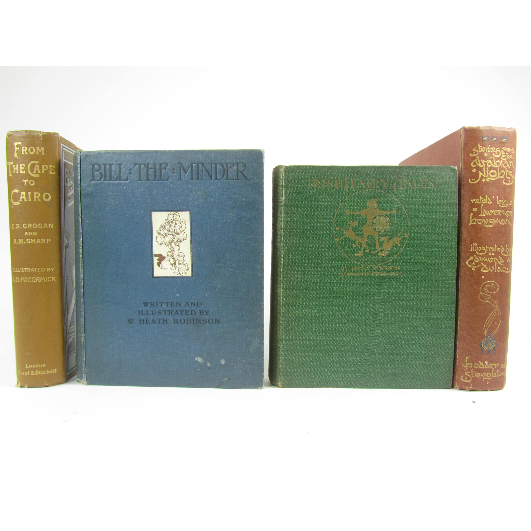 From the Cape to Cairo. London: Hurst & Blackett, 1900. First edition, frontispiece, plates, 3 maps (2 folding), original pictorial cloth gilt, small nick to head and base of spine; Rackham, A. & J. Stephens Irish Fairy tales. Macmillan, 1920. large 8vo, 16 coloured plates, pictorial green cloth gilt; Housman, Laurence Stories from the Arabian Nights. Hodder & Stoughton, November 1907. Second edition, 4to, 50 coloured mounted plates by Edmund Dulac, original ochre red pictorial cloth gilt, slightly rubbed; Robinson, W. Heath Bill the Minder. Constable & Co., 1912. 4to., 4 coloured plates, illustrations, original blue pictorial cloth, occasional spotting, inscription to endpaper, binding slightly rubbed and soiled (4)