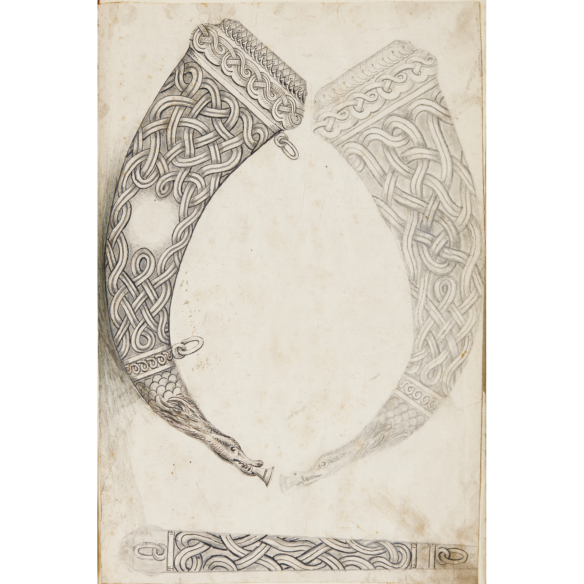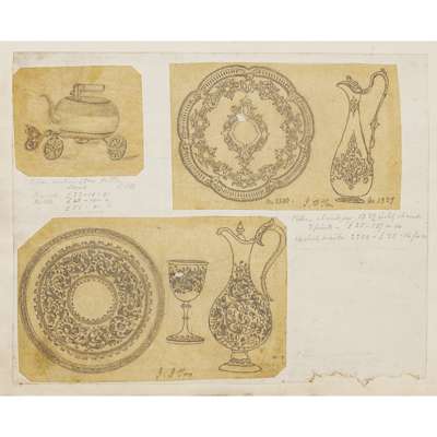 2 folio volumes containing original silver and jewellery designs of the company Fraser, Ferguson & MacBean, along with photographs and prints of both completed items, and presumably objects which provided the designers with inspiration, also pages of manuscript notes on the properties of various metals and gems, c.1900-1910, contemporary half calf, worn, spines and boards detaching (2)