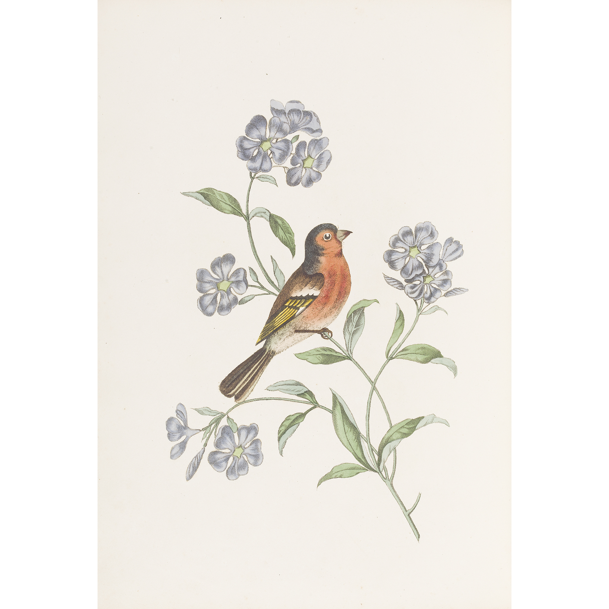 Groups of flowers, drawn and accurately coloured after nature... [with groups of fruit and birds]. London: Thomas McLean, 1819. Second edition, folio, 33 (of 36) plates only (flowers: 5 plain, 3 hand-coloured and 1 partially coloured; fruit: 6 plain, 6 hand-coloured; birds: 5 plain, 6 hand-coloured, 1 partially coloured), contemporary red morocco gilt, some foxing and occasional slight dust soiling, some rubbing