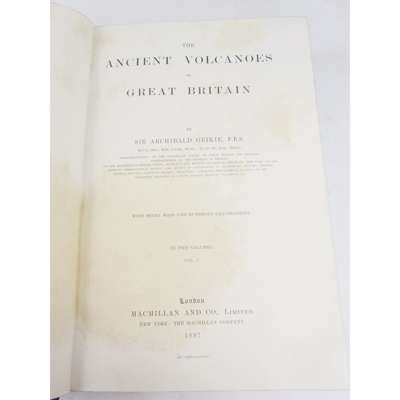 The ancient volcanoes of Great Britain, London: Macmillan and Co., 1897, 8vo, 2 volumes, 7 folding maps, contemporary half blue morocco, spine gilt, browning to title page, some spotting throughout, extremities lightly rubbed; together with 9 other works by the author.
