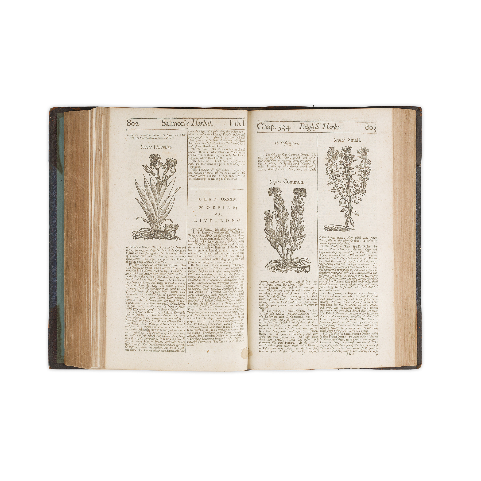 Botanologia, the English herbal: or, history of plants. London: I. Dawks for H. Rhodes; J. Taylor, 1710. Folio, engraved title, title-page in red and black, woodcuts (some hand-coloured), nineteenth century half morocco, bookplate, several pages repaired sometimes affecting text and running titles, engraved title lacking around one quarter of engraved area and laid-down, 5 leaves lacking (the gathering 6R and 7K1), some adhesion between pp.1119-1121, some soiling, several holes to index affecting text, upper cover and spine detaching, rubbed [ESTC T83065]
