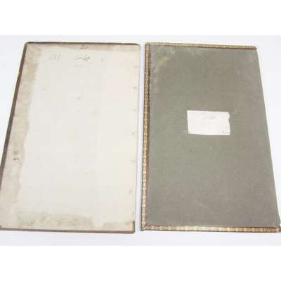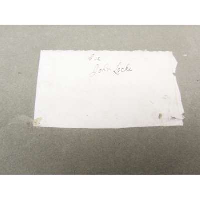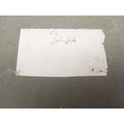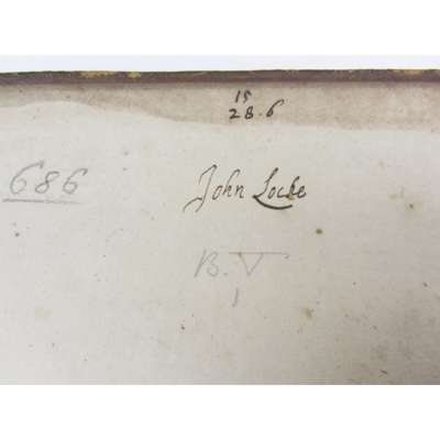 John Locke's signature on two detached folio boards, one from a 17th century calf bound volume, the second on a slip of paper pasted onto the board of a volume once bound in early 19th century russia gilt (2)