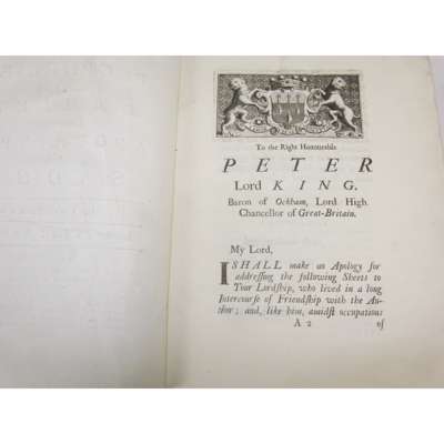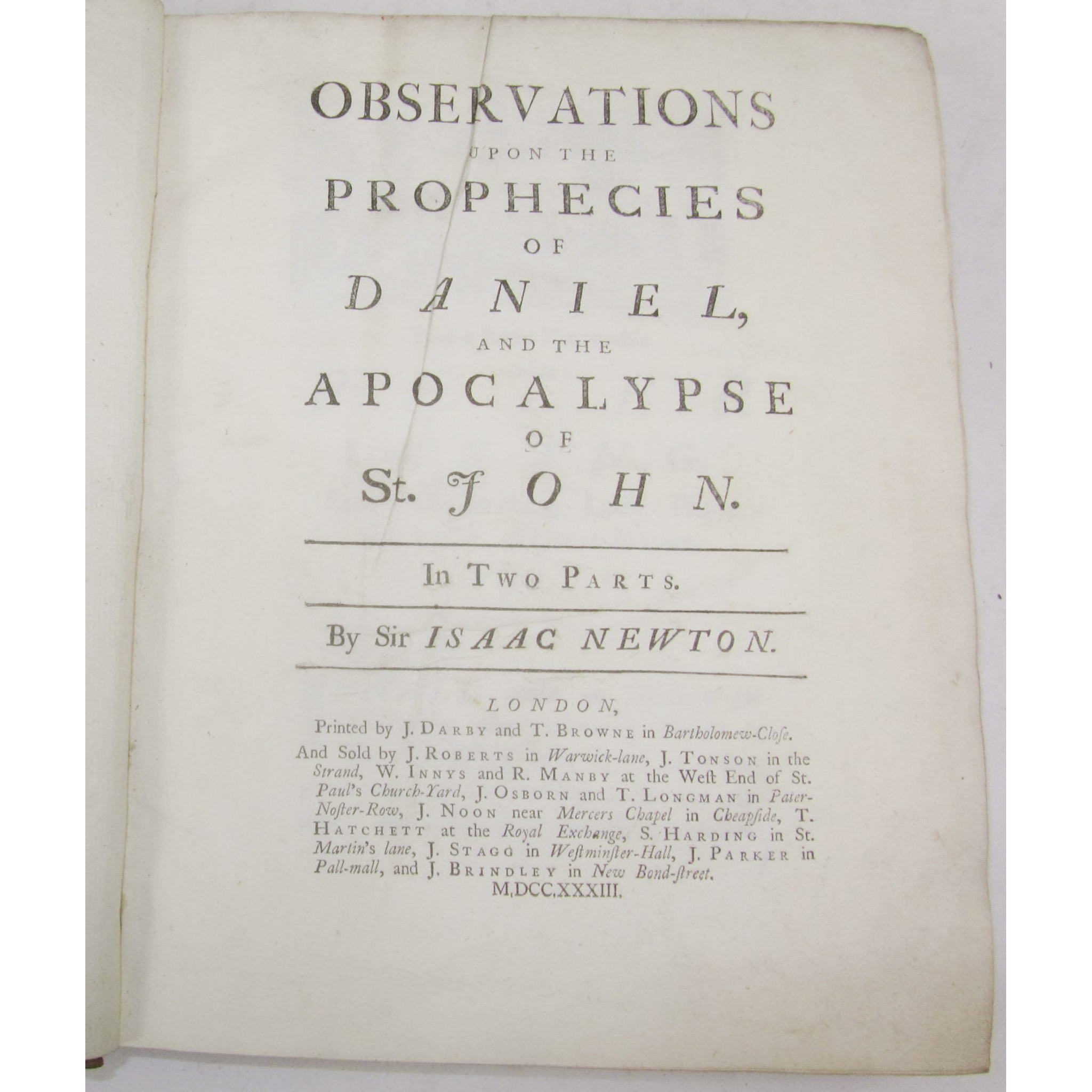 Observations upon the prophecies of Daniel. London: J. Roberts [&c.], 1733. First edition, 4to., contemporary calf, gilt arms of Lord King on sides, rubbed, stamp on endpapers of "Library, Ben Damph Forest" and "Ashley Combe"