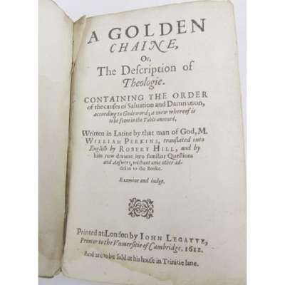 A golden chaine, or the description of theologie. London: John Legatte, 1612. 8vo, 5 folding tables, contemporary limp vellum, [ESTC S102075; recording 4 copies in UK libraries, and 1 in USA libraries], occasional slight dampstaining; stamp on endpaper of "Library Ben Damph Forest" and "Ashley Combe"