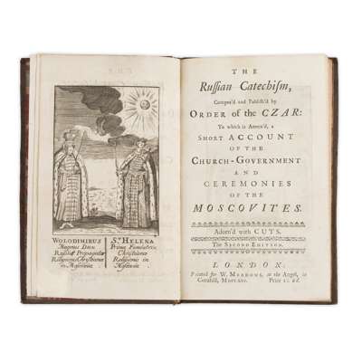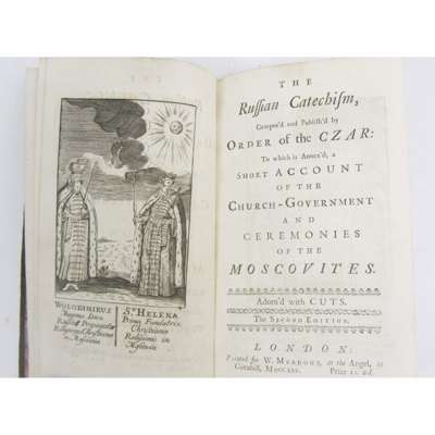 The Russian Catechism, compos'd and publish'd by order of the Czar. London: W. Meadows, 1725. Second edition, 8vo, frontispiece & 4 plates, 2 folding, contemporary calf, rubbed