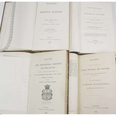 Elements of political economy. 1824. Second edition, 8vo, half calf; Whateley, Richard Introductory lectures on political economy. 1831. 8vo, half calf; Review of the agricultural statistics of France. 1848, with A.L.S. from Mons. Rubichon & Lucius Cary, 10th Viscount Falkland, about the Review, bound in or loosely inserted, bound with several other book reviews, in 2 volumes, half calf (4)