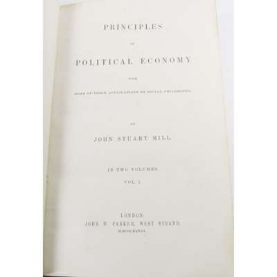 Principles of political economy with some of their applications to social philosophy. London: John W. Parker, 1848. 2 volumes, first edition, 8vo, contemporary quarter calf with red morocco gilt labels to spines, repair to pp.593-4 in volume 1 with loss to some text, ownership stamps of 'G Muir, 11 Buccleuch Street, Glasgow' to endpapers, some annotations to text in pencil