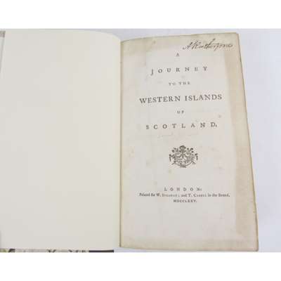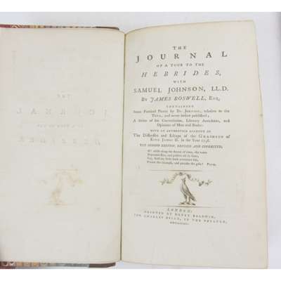 A journey to the Western Islands of Scotland. London, 1775. First edition, with 12 line errata, modern quarter calf, Boswell, James The journal of a tour to the Hebrides. London: C. Dilly, 1785. Second edition, 8vo, half-title, modern quarter calf; Davies, Edward Celtic researches. London, 1804. 8vo, 2 engraved plates, contemporary half calf, joints splitting; Selkirk, Thomas Douglas, 5th Earl of Observations on the present state of the Highlands of Scotland. 1805. First edition, 8vo, modern quarter calf, uncut, half-title (4)