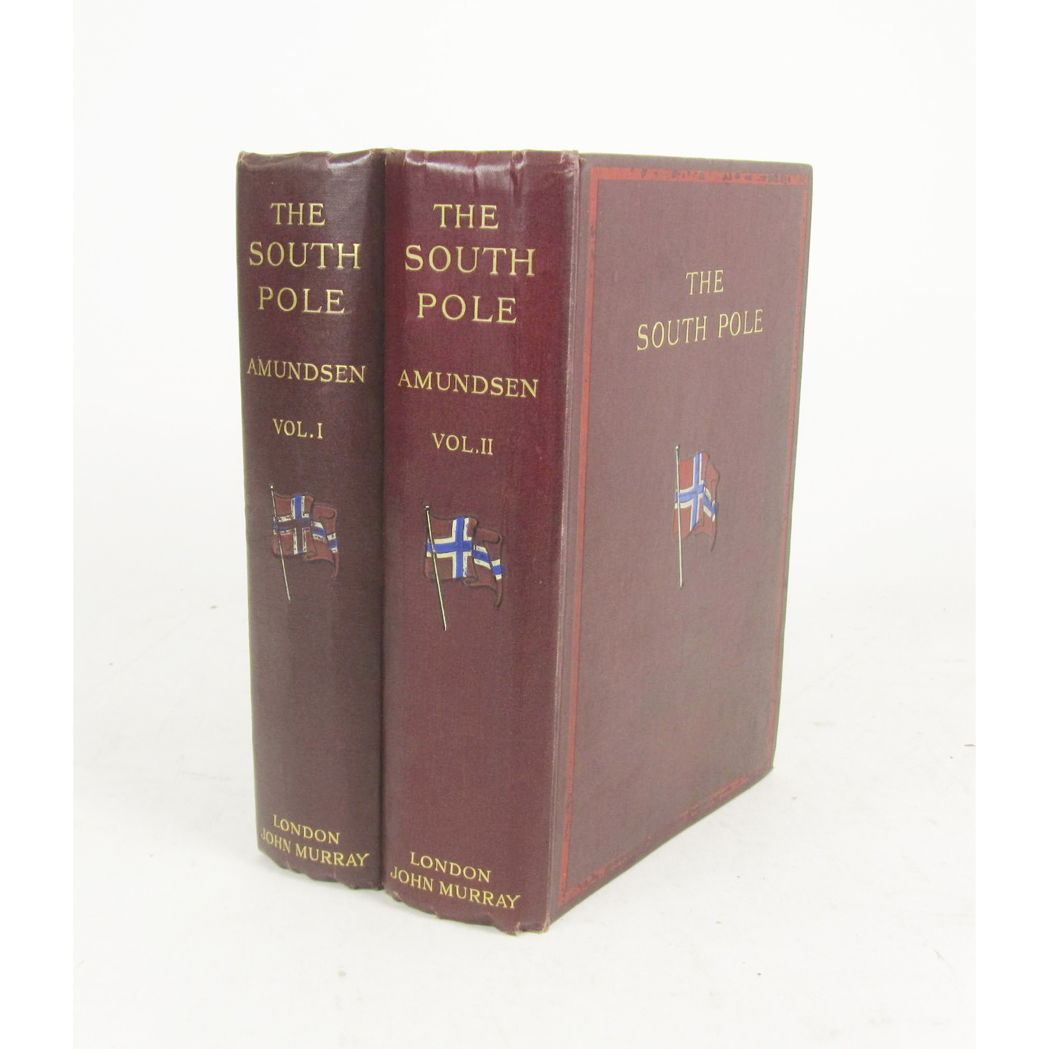 The South Pole: An Account of the Norwegian Antarctic Expedition in the "Fram". London: John Murray, 1912. First English edition, 8vo, 2 volumes, photographic plates and folding maps, original pictorial burgundy cloth with guilt lettering to spines, some browning to endpapers, some light marginal spotting, occasional pencil annotations in volume 1, some plates semi-detached, one plate in volume II detached, folding map in volume 2 torn, slight wear to head and foot of spines, extremities lightly rubbed, clean copy. (2)