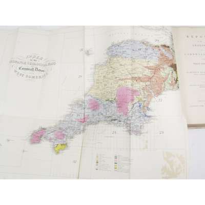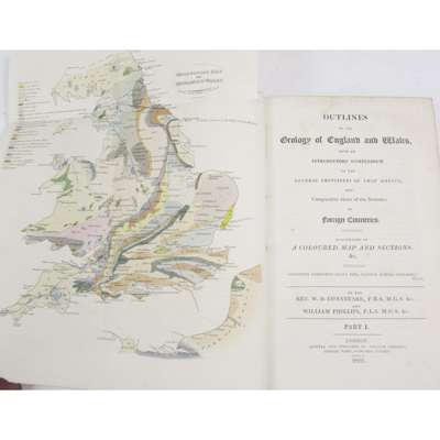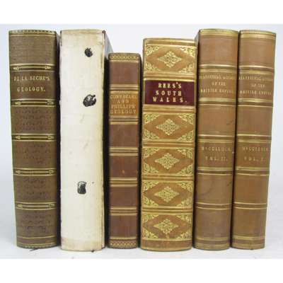 Report on the geology of Cornwall, Devon and West Somerset. 1839. 8vo, 12 plates, some folding, & 1 facsimile, half calf gilt; Conybeare, W.D. & W. Phillips. Outlines of the geology of England and Wales. 1822. Part 1 (only), 8vo, 2 hand-coloured folding plates, folding table contemporary calf gilt; Savage, James History of the hundred of Carhampton. Bristol, 1830. 8vo, frontispiece, coloured folding plan, half calf, spine detached; Rees, T. The beauties of South Wales. 1815, 8vo, engraved title, plates, contemporary calf gilt ; M.Culloch, J.R. Statistics of the British Empire. 1837. 2 vol., 8vo, half calf, (6)