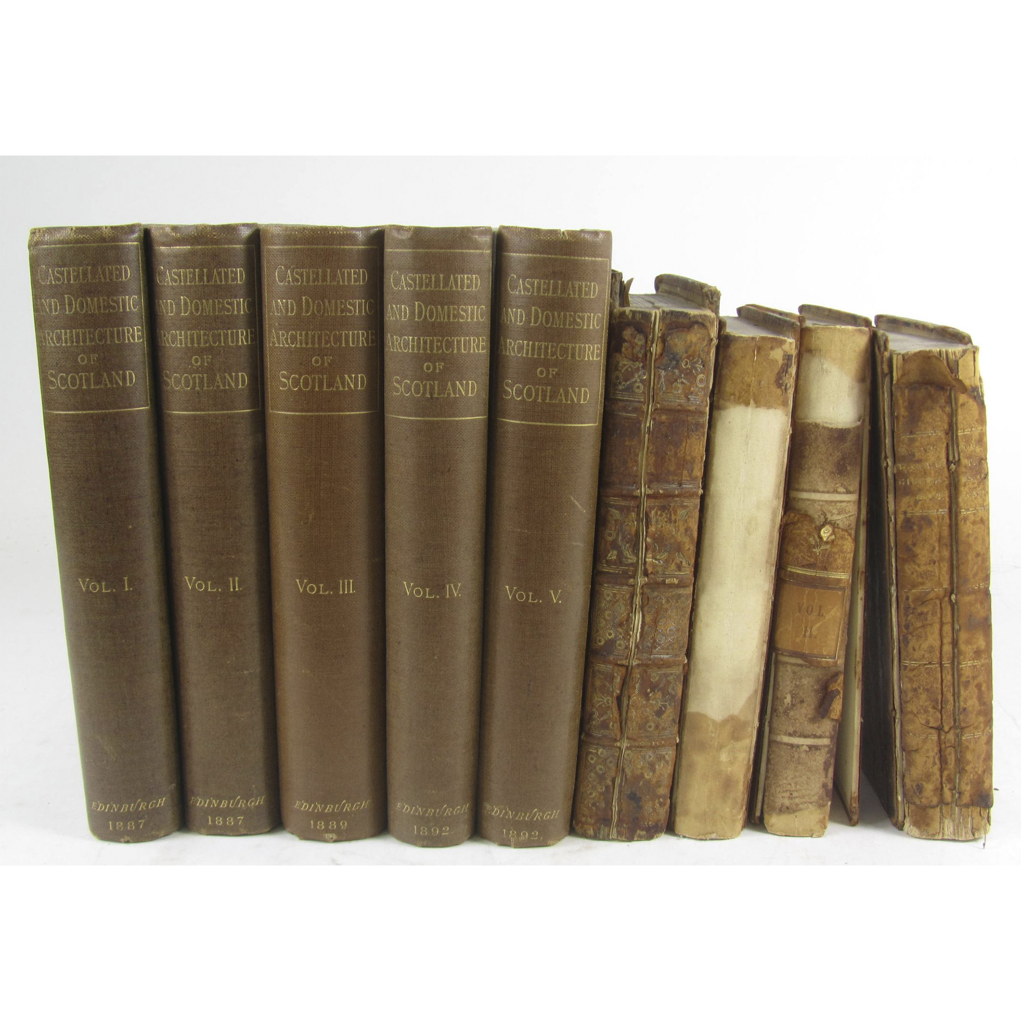 A tour through the Highlands of Scotland, and the Hebride Isles. 1787. First edition, 8vo, contemporary half calf, worn, covers detached; Pennant, Thomas A tour in Scotland and voyage to the Hebrides. Chester, 1774. 4to, engraved title & 44 plates, contemporary calf, covers detached, textblock split; MacGibbon, D. & T. Ross The castellated and domestic architecture of Scotland. Edinburgh, 1887-92. 5 vol., 8vo, illustrations, original pictorial buckram gilt, t.e.g., and 2 others (9)