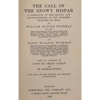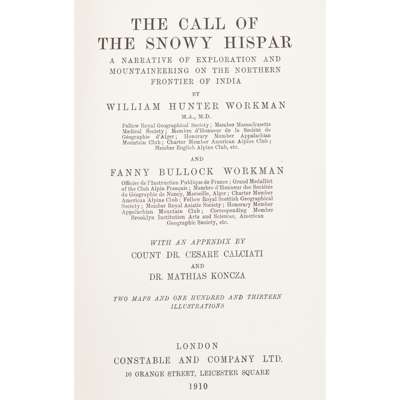 The call of the snowy Hispar. London: Constable and Company Ltd., 1910. First edition, 8vo, half-title, plates, 2 folding maps, original pictorial red cloth gilt, occasional foxing and slight dust-soiling, hinges a little split, some rubbing and wear to spine and covers