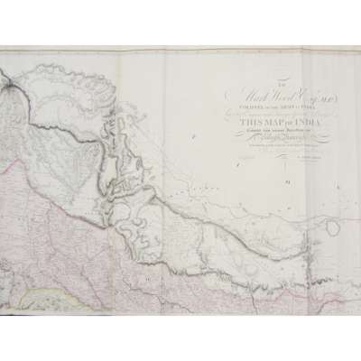 Note: One of the rarest, largest and most beautiful maps of India produced in the 19th century. It was originally published in six sheets, and is now joined as three sheets. It shows British controlled areas at the turn of 18th century, and is enriched by much new material, supplied by the numerous "route surveys" carried out by the army. Very rare: only 3 copies found on WorldCat: British Library, Harvard and Bibliothèque Nationale et Universitaire; only 2 copies traced at auction since 1979.