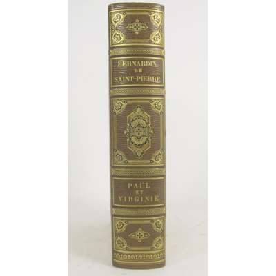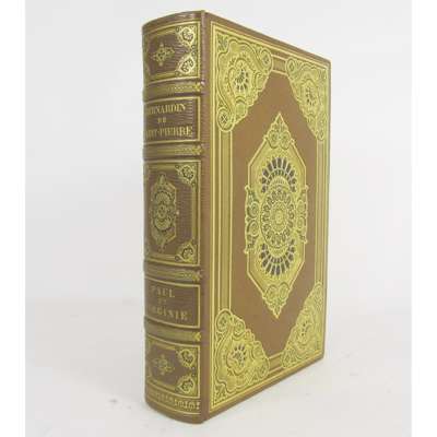 Paul et Virginie. Paris: Curner, 1838. Large 8vo, portrait, plates, illustrations in the text, light brown straight-grained morocco gilt, richly gilt and inlaid in imitation of a cathédrale binding, green silk linings, original wrappers bound in, g.e., in a half morocco chemise and slipcase, by Henri Noulhac, 1921