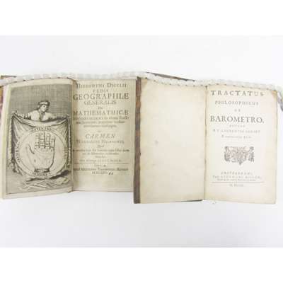 Tractatus philosphicus de barometro. Amsterdam, 1703. First edition, 12mo, 12 full-page engravings of barometers &c.; Ditzel, Hieronymus. Paedia geograpicae generalis. Leipzig, 1716. Small 8vo, engraved frontispiece & woodcut illustrations, folding tables, K1-2 bound after M3, contemporary half calf, the Macclesfield copy (2)