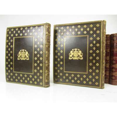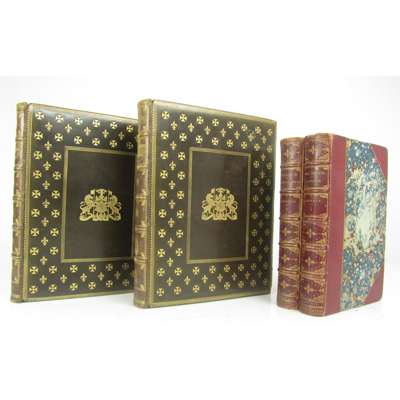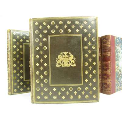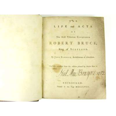 The Life and Acts of the Most Victorious Conqueror Robert Bruce, King of Scotland. Edinburgh, 1758. 4to., final leaf with loss of blank margin ; The Acts and Deeds of the most Famous and Valiant Champion Sir William Wallace. [c.1758], 4to., lacks title, fine black morocco emblematically tooled enclosing Scottish Royal coats-of-arms, g.e., bookplate of David MacBrayne, some spotting and occasional marginal dampstaining; Jamieson, John The Bruce, or the Metrical History of Robert I King of Scots by Master John Barbour. Glasgow, 1869. 2 volumes, 8vo, red half morocco, one cover detached (4)