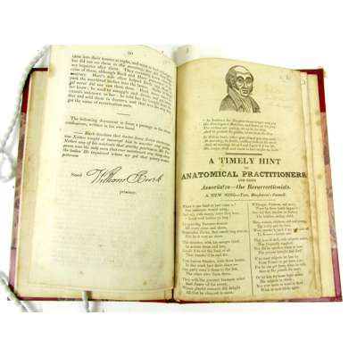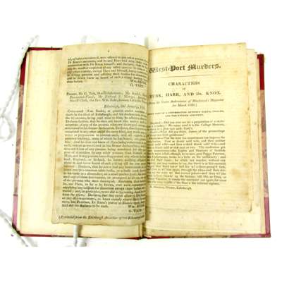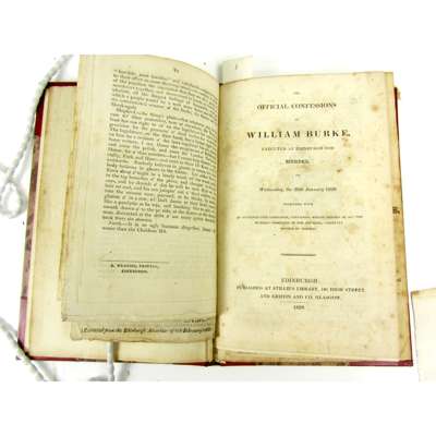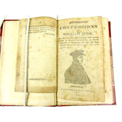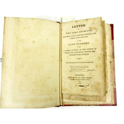 Letter to the Lord advocate, disclosing the accomplices, secrets and other facts relative to the Late Murders. Edinburgh: sold at no. 132 High Street, 1829, 36pp.; Authentic Confessions Of William Burke, who was executed at Edinburgh on 28th January 1829. Edinburgh: R. Menzies, 1829, 8pp.; West Port Murders. Edinburgh: R. Menzies, [1829], 12pp.; The Official Confessions of William Burke. Edinburgh: Stillie's Library, 1829; 20pp.; A timely Hint to Anatomical Practitioners. [Edinburgh, 1829], 1 page, apparently lacking last 2 stanzas; Rhymes on Reading the Trial of William Burke and Helen M'Dougal for Murder. Edinburgh: J. Hutchison [1829]; and 2pp. "correspondence", red half calf, bookplate of William Harvey, somewhat spotted